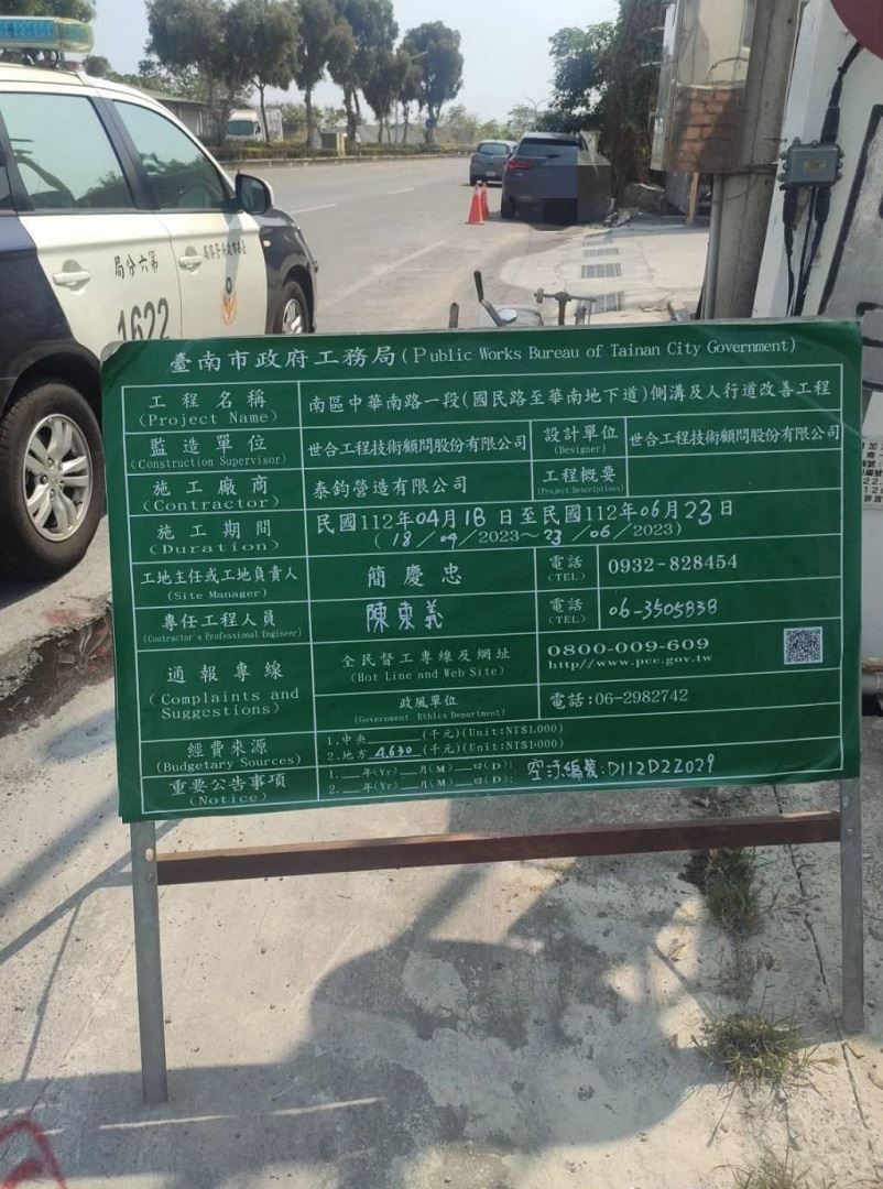 【記者尤華恩/台南報導】臺南市政府工務局為辦理「南市南區中華南路一段(國民路至華南地下道)側溝及人行道改善工程施工」,將於本(112)年4月18日至6月23日進行為期2個月路面刨鋪及挖掘施作,施工期間將封閉該路段部分路肩。請用路人行經中華南路施工區域時,依既有指示牌面及施工單位架設導引牌面說明行駛或為避免不便,可提早改道行駛,並遵守管制人員導引,以確保行車安全。
