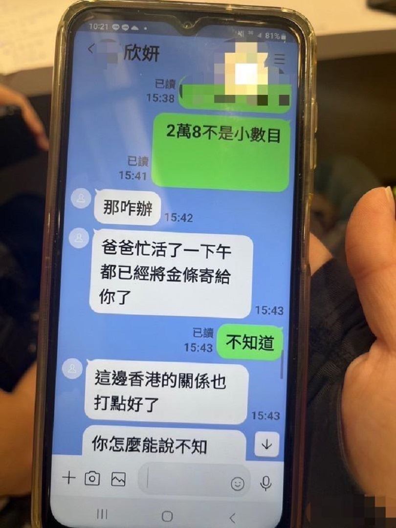 第二分局南門派出所巡佐邱漢文、警員詹雅淳馳抵時,郭男一度支吾其詞,惟在員警說明解釋之後坦承自己在LINE上認識一名女網友「欣妍」,這名女網友告訴他,家中有珍藏一塊200克的金條,價值10萬多元港幣(約新台幣40萬元),只需要郭男交付新台幣2萬8千元之後,就能收到這一塊「傳家寶的金條」。