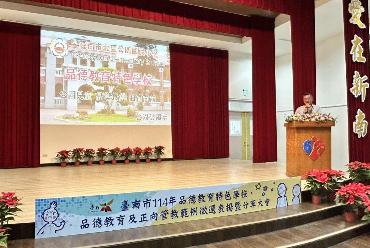 市長黃偉哲表示,優良品德是培育健全公民的關鍵基石,臺南市積極整合校內外資源,運用創新教學方法,將品德教育的核心價值向下扎根,從校園擴展至家庭與社會。同時,市府大力推廣正向管教,透過專業輔導策略,建立教師與學生間互信互重的良好關係,讓臺南的下一代在充滿愛與關懷的環境中茁壯成長。