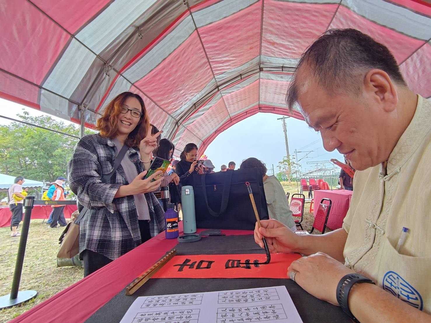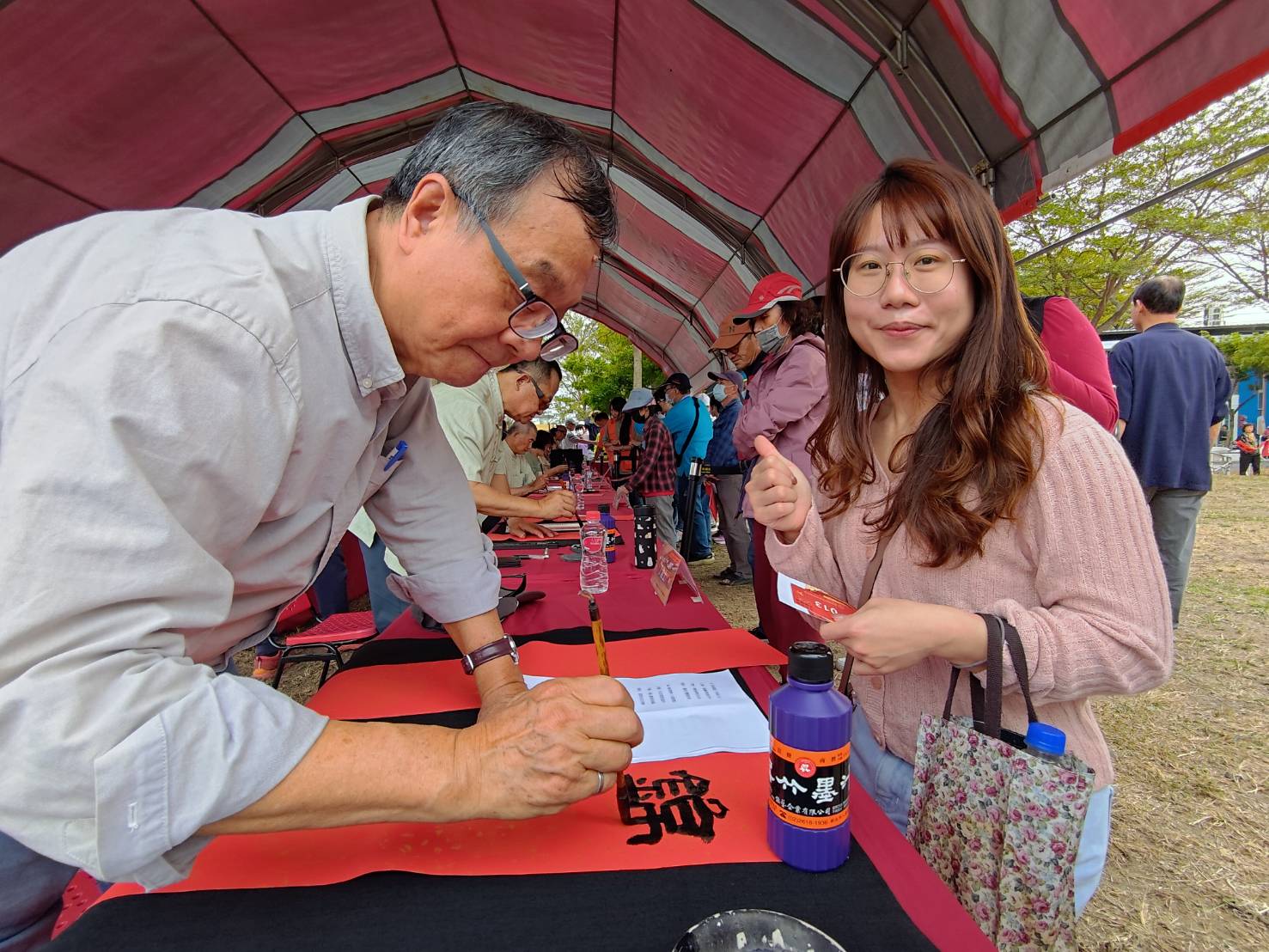 書法家丁澈士教授則表示,不少鄉親特地帶著家人、孩子前來拿春聯,尤其作品中多採用傳統春聯字句與年味祝福,如「福滿南疆」「吉星高照」「家和萬事興」等三字式成語與寓意佳句,強調傳統文化與生活祝福的連結,讓鄉親感受到濃厚年節氛圍之外,更能在傳統與當代文化中找到交融與共鳴。